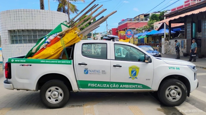 A Secretaria Municipal de Meio Ambiente e Urbanismo (Semurb) realizou fiscalização na praia de Ponta Negra para verificar o cumprimento das normas de usos e ordenamento do espaço público. Durante a ação, foram apreendidos 16 guarda-sóis que excediam o limite permitido pela Prefeitura, que estavam sendo utilizados pelos comerciantes no local.