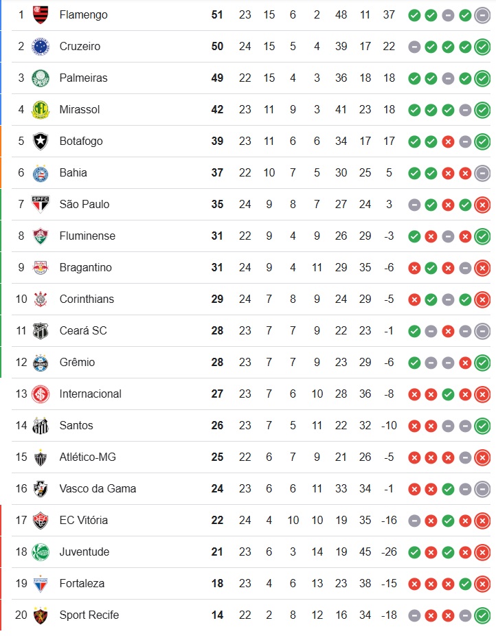 O Cruzeiro confirmou mais uma vez a sua força no Campeonato Brasileiro ao derrotar o Red Bull Bragantino por 2 a 1, de virada, no Mineirão, neste domingo. Com 50 pontos, o clube mineiro encosta no Flamengo e deixa para trás o Palmeiras, reforçando a condição de candidato direto à briga pelo título.