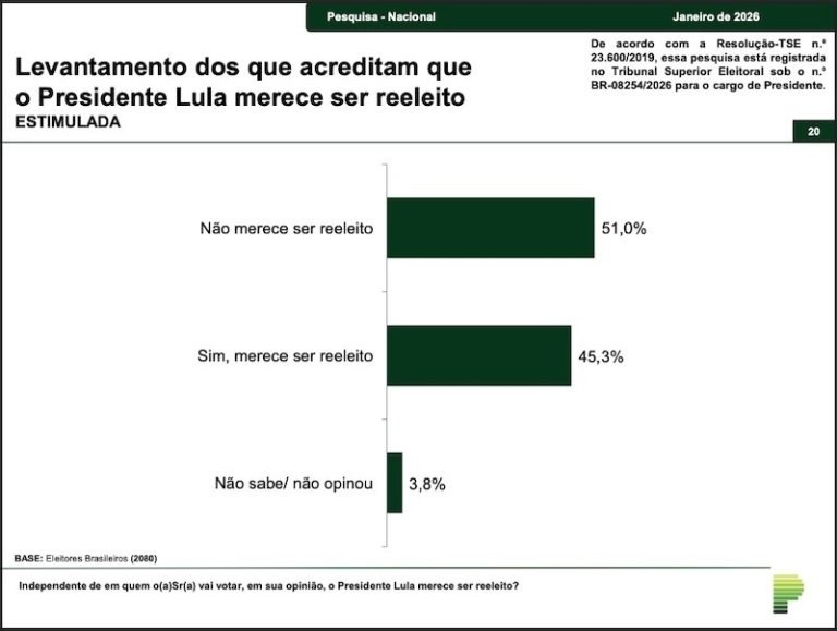 A pesquisa, que foi registrada no Tribunal Superior Eleitoral (TSE) sob nº BR-08254/2026/2026, aponta que 45,3% dos eleitores brasileiros, ao contrário, consideram que o petista merece mais um mandato no Palácio do Planalto. Ficaram em cima do muro, sem opinar, 3,8% do total.