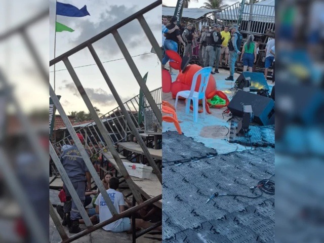 Créditos: Reprodução Redes sociaisParte da estrutura de uma arquibancada montada para a gravação de um programa de TV desabou nesta terça-feira (10) na praia de Barreta, em Nísia Floresta, na região metropolitana de Natal. O acidente aconteceu no momento em que convidados estavam sendo acomodados no local, provocando a queda de várias pessoas.