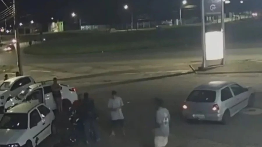 As imagens de câmera de segurança mostram o momento em que o policial desceu do carro para tentar separar a briga. Um dos homens envolvidos na confusão estava no chão, enquanto o que disparou contra o policial estava em pé, batendo em outro homem.