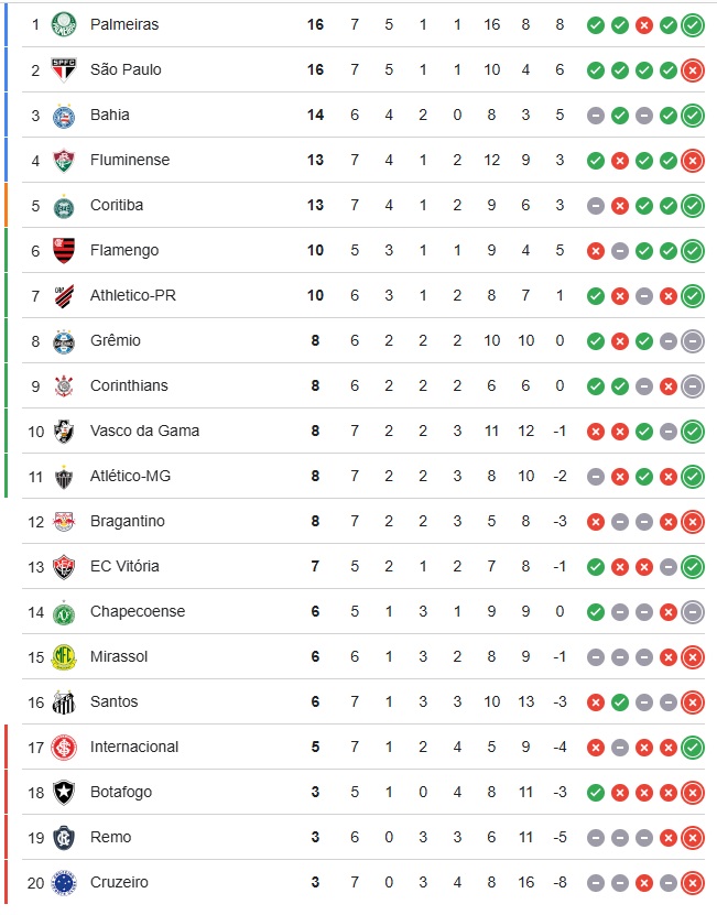 Após o revés fora de casa, a equipe do técnico Roger Machado permanece com 16 pontos, mas com um saldo de gols pior do que o Palmeiras. Agora o São Paulo é o vice-líder da competição.